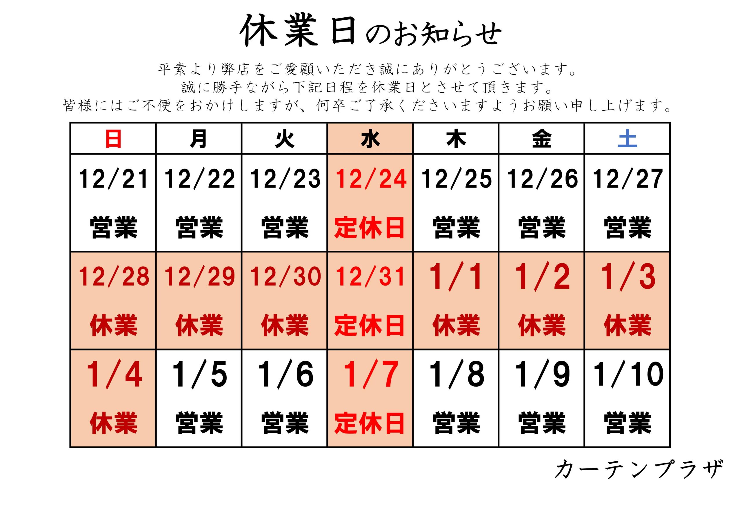 年末年始 休業日のお知らせ